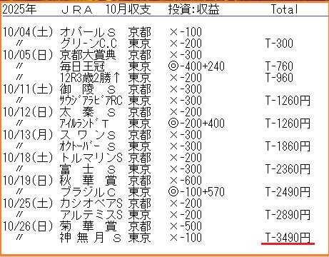 まぁ最近の競馬は、小金額の馬券しか当たりませんね。10月競馬収支です。