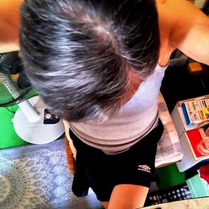 今日は日中32℃まで気温は昇りましたが・・風も強く部屋に入るので感じは涼しい。夜、入浴時の髪洗いは、ダルイので夕方早めに髪を洗いましたが・・時期的なものも有るのでしょうか?結構に抜け毛もありましたのでどうも気になって、洗髪後--椅子に座って頭のてんこの自撮り(^^;若干の白髪はあるものの「よかった~っ」ハゲ頭じゃ無くて(笑近隣の同期生あたりの頭の毛は、結構に薄い人多いですからねぇ~・・何しろこの暑さ、家での服装は短パンにタンクトップ.一応は部屋着です。ちなみに、体重は55Kgですから-・腹も出て無いし脚も美脚です(BMI=20.1)💦窓は全開放・エアコンは隣室のみ。まぁ暑さ慣れしています今の処は(^^さて、先日の7月予定で抜け落ちていたのが・・第三日曜の{側溝清掃日/建屋階段掃除)参院選投票とお盆の迎え火(7/13)送り火(7/13)これらも予定追加ですね。先日、部屋を買い引っ越して来た人は、75歳単身男性でした。ぃゃまぁ。。また この建屋に高齢者が一世帯増えました。町内会この班の組長としましては・・う~ん。。また気を配らなきゃならんねぇ../と思いつつ--行雲流水の気分ですが なるようにしかならんねうちのベランダの鉢植えのオシロイバナの紅い花が咲きました。アサガオにしろオシロイバナにしても・・咲くのは朝か夕 日中の陽射しは開花は無理ネ私的な他の事は、ほぼありませんなぁ(笑 大体において交遊なるものも面倒臭い!