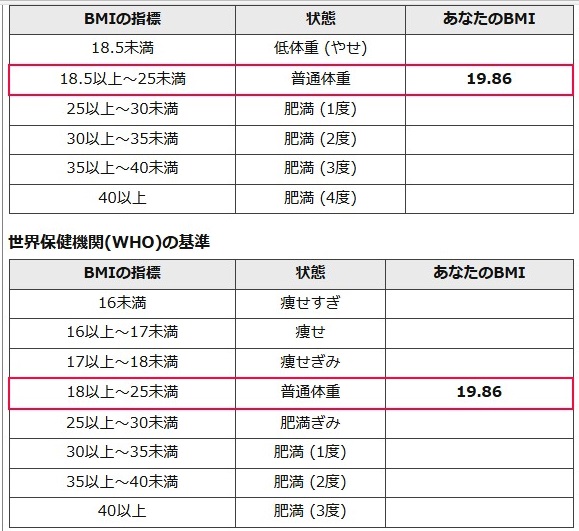 夜になって、雨が降り出した。明日 午後までは☂かな?風呂上がりに体重計に乗ってみたら・・55.4Kgでした。最近はお腹の脂肪も減ったようで、昔のジーンズのウェストでも穿ける(^^で・・実際、BMIの計算が出来るサイトに飛んで計算してみた。以下が、簡単に身長・体重を入れれば 自動計算してくれます。https://www.calc-site.com/healths/bmi結果:19.86BMI まぁ標準値ですが、やや痩せ気味かな?指標としてはこんなところですが・・イラストですと、こんな体形になるんでしょうな(^^でも、これはこれで良いのですが・・他の疾患との微妙な絡みも、医学的にはあるような気がしないでもありませんしね。実際には、加齢と筋力低下で疲れやすくなってますもんね。。まぁ何でも一つの事を見据えての、良し悪しの判断は無理かもねぇ。町内の組長になったのは良いのですが・・どうにも・・バラバラで仕方ないような気がしたのでゴミ搬出に関する予定とかは、現状は掲示板に貼りだすのですがどうも古くからの掲示ビラをコピーして使っているようですのでこの際、新たに原本を作り直しました。いやまぁ。。シンドイ事ですなぁ~・・Win10のワードソフトやエクセルを酷使して。元々、私は事務屋の職じゃありませんのでねぇ..脳ミソ疲れ捲りでしたな..それに、来年の組長当番は初めて組長をやる40代の一人住まいの現職女性ですからこの辺で、上手く年間の雑用を回せるように、これからマニュアル作りもしようと思います。まぁねこれも一つの思い遣りでしょう・・と。