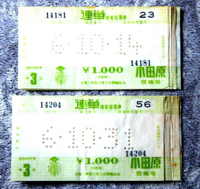 九州では梅雨入りしたとのNewsがあったから近々、この辺りも梅雨の様相を呈して来るんじゃないかと思っています。精々、布団干しも今日が限界かもなぁ。。。昨日、クリニックの1ヶ月検診に行って来ましたが・・案の定、待合室で順番を待っている間に、眠くなり少しコックリ診察と言っても重篤な病巣を抱えている訳でも無いし血圧計って・呼吸を聴診器で看て、ダベって終わり。以前は、血圧も150~160あったものも、今や120以下 眠い時は110以下。どうやら処方される薬は、降圧剤では無く 心臓の補強剤みたいなもんですね。恐らく、脈拍の不安定さに医師は注視してるんでしょうかね??さて、脈拍の不安定さよりも、米の価格の不安定さの方が気になる現状ですが--我が家では5Kgの米を食べるのに約3週間朝は、概ねパンやスーパーのおにぎりとバナナくらいな物昼は、ご飯になったり・麺類になったり・夜は米飯とおかず。そんなもんです(^^ただ、マルチビタミン・オメガ3(DHA.EPA.ALA)のサプリは飲んでますけどね。で・・肝心の米の話ですが・・政府備蓄米は、古米にはなりますが それぞれの通販サイトで入手を試みましたが兎に角、PCの回線が混雑してたらしく殆ど繋がりませんでした。繋がった時には、完売御礼だとか・完売しました。とか・・某サイトでは、1回目完売ー2~4回目は抽選外れで入手不可。古い米の再入荷があったらしく、登録Mailに販売案内が届いて、やっと購入手続き終えた。5Kg-送料込で2,560円 どうだかねお味は??この間、他サイトから5Kg4,500円以下の銘柄米を仕方なく2袋買っている。これから--近々、5Kg備蓄米が届く。 その後6/20日頃迄には銘柄米5Kgx2袋が届く。さてね..これらがいつ頃まで喰いつなげるか判りませんが、取り敢えずは落着。まったく。。終戦直後じゃあるまいし・・と内心は思っております。(=.=;断捨離を、また始めたんですが・・片付かないねぇなかなか。。何時.何処での紛れ込みの品かも知れない物が出て来た。昭和48年の小田原競輪の{穴明き車券}連単30枚の外れ?特券多分..小中学の頃?、叔父に くっ付いて行った小田原競輪場の物だろうね恐らく、この頃のサラリーマンの月給は、6~7万円だと思うけど・・ギャンブルに3万も突っ込んじゃうのって、何なの??イカレてるよねぇ(笑こちらの半券等も、まだまだ沢山あるのですが・・年代も??自分が行った覚えもあるものも無いものもゴッチャですね。この辞典類・・今やパソコンやスマホで調べられるんですから本棚にただ嵌っている物と化している。これは小僧の物ですが無用の長物と化しています。・・と言った塩梅ですが、ご無沙汰してた割には しょんない話。。