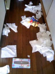 先日で40分ぐらい所に住んでるお友達の家に遊びに行きました。彼女とは高校3年間すっと一緒に過ごして、お互い旦那さんの仕事の都合で地元三重から愛知に来て同じぐらいの子供がいてと、とても心強い友達なのですだけど今年の春に旦那さんの転勤が決まったらしく三重に帰ることになって、彼女としては住み慣れた場所に帰るので喜ばしいことで、喜んであげたいんだけど私はとっても寂しいです暖かくなる頃にはお互い子供も歩けるようになって一緒にいっぱい遊べると思ってたのにな~。でもまあ地元に帰ったらまたいつでも会えるんだけどね娘は歩くのが少し遅くて1歳3ヶ月の時でした。当初は歩いてるの見るのが嬉しくってお菓子でつったりして無理矢理歩かせてたなでも歩けるようになったと同時に色んないたずらが増えた気がします。今日もちょっと目をはなしたすきに部屋が・・・こんな風でしたこれからどんどんいたずらが増えてくるんだろうな