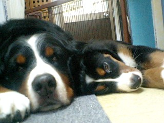 臣の肉球の変化です。使用前・使用後的な感じ?だんだんと刺激が与えられて黒くなっていくんだそうです。大きいお姉さんが言ってました。大きいお姉さんは以前はトリマーの学校に行って木俣さんではないのですが獣医さんに勤めていました。今は伊豆のほうで修行の身です。だから大きいお姉さんが来るとスパルタでビシビシやられています。たまにはこんな風に仲良くしています。寄るとさわると、どちらかから ちょっかいを出すのでなかなかうまく写せません。これって仲がいいというんでしょうね~!!