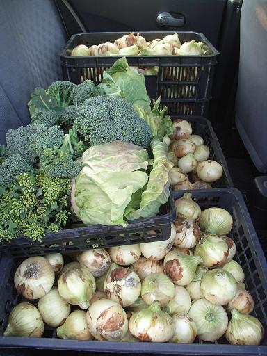 実家の母が 畑が趣味で毎年たまねぎをくれるのでもらいに行ってきました。 たまねぎ・キャベツ・ブロッコリー・夢咲菜などなど まだこのあとサニーレタス・レタス・などをいただいてきましたよ畑にコンテナに入ってたまねぎが置いてあります。少し離れた自宅まで一輪車で運ぶんですよもうかたずけも終わりごろなのでコンテナに入ったたまねぎも少しになりました。 ちなみにたまねぎは畑でこんなふうに植わっています。お米の苗のような苗を畑に植えてここまで大きくします。こちらの地区のたまねぎはサラダオニオン(?)て名前でどっちの料理ショーにも出ましたよ。サラダオニオンはもっと早い時期の白いたまねぎですが・・・ ブロッコリーはこんなふうに出来るんですよ知ってました? こちらは夢咲菜って言うのですが菜の花と同じような感じに見えますが花がすくない?ずんずん後から後から出てきます。私もこんなに大きいものとは知りませんでした もうちょっとで母の日ですね。実家の母もフルーツ好きなのでいろいろありますが悩んじゃいます。