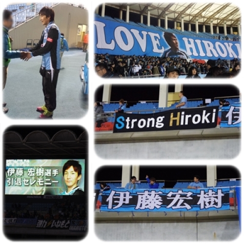 Jリーグ最終戦はホーム等々力だったけどチケットが取れず。相手が勝てば優勝のマリノスの凄い試合だっただけにチケットは完売だったのよぉ。そして直前の伊藤宏樹の引退発表。最終戦後に引退セレモニーをやるとなったので特別措置で試合後は無料で入場できることになりました。その代りフロンターレファンである事を証明できるよう何かしら応援グッズを見につける事が条件でした。テレビで最後まで試合観戦しフロンターレの勝利をしっかり見届けてから急いで等々力へ。J1終了の社長やキャプテンケンゴの挨拶のあとにヒロキのセレモニーが行われました。特別映像には泣けました。最後は全員と握手をしてくれました。結構前の方だったけど1時間以上まちましたぁ。でもしっかり握手出来て良かったです。絶対天皇杯取りましょう!と伝えたんだけどね…残念ながら22日が引退日になってしまった。1日国立をヒロキの引退の日にしたかったのにね。とにかく13年間フロンターレ一筋のヒロキお疲れ様でした!!