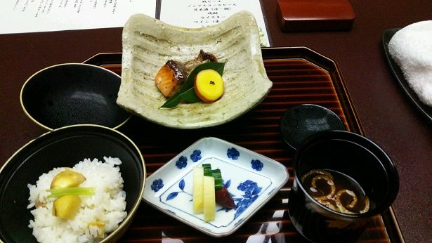 季節のごはんは栗ごはん。しゃけの焼き物。赤出汁。