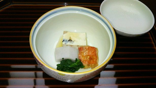 先付(前菜)。さざえのつぼ焼き(バターかオリーブオイルにチーズもかかって、エスカルゴ風。大変おいしい)、百合根饅頭、きのことお麩の白和え。見た目もすばらしい。