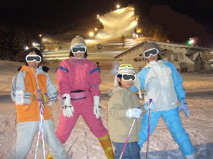 ガキが、「 スキー行きたい!行きたいっ!学校の山じゃ物足りないっ!!行きたいーーー! 」って騒ぐもんだから「 そうかー、我が家のガキ共もとうとうそこまで上達したかーー! 」などと一人嬉しくなり近くのスキー場まで連れて行くことにした。実に十数年ぶりのスキーだ。親バカなわたしは勿論ビデオカメラとデジカメ持参である。スキー場に到着し駐車場で長靴をスキー靴に履き替え「さあ、行くぞーー!」と2、3歩あるき出したら、妻のスキー靴がいきなり「 べりっ!!」と こわれた。 ( 一同きょとん??? )「えっ、何っ何っ??」十年以上も物置にしまっておいたため、プラスチック部分が硬化して履いた途端その部分が割れたのだった。「 あーあ、どうすんの?」ということで、いざ妻だけ 長靴 でレッツゴー!! ( カッコ悪ーー!! )嬉しいことに、この日は 「キッズ無料デー」 だという。家族みんなのリフト券だけで 1万円以上 は覚悟していただけにほんとラッキーだ。さっそく一緒に滑った。が、全然たいしたことなかった。「 ケッ! おめーらここまで連れて来させてボーゲンかいっ!! 」ガックリである ・ ・ ・ 。「 そんなんじゃ学校の山で十分だろっ!! 」などと叫んだが、奴らはおかまいなしだ。なんだかんだ言いながら結局ナイターまで滑ってきた。 ↑ひとり長靴の人が ・ ・ ・ カッコ悪っ~~~!!!みんなポーズだけは一人前