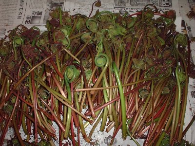 そんなに長くいなかったので、収穫はちょっとだけ。ゼンマイ、コゴミ、シドケ、ウド、ボンナが採れた。ゼンマイはもう終わり。これからはシドケ、ボンナ、アイコ、蕗、ワラビなど。もうちょっとするとタケノコ(ネマガリタケ)のシーズンが到来。【ゼンマイ】知らない人はいないくらいポピュラーな山菜ゼンマイを採る時は他の山菜採りとは違って、ちょっとした生傷覚悟で。これを茹でてから日に当てて何日も乾燥させる訳だが、乾燥後はほんのちょっとの量になる。保存が利くので冬でも煮付けなどに入れて食べる。 ( 大好物!!)【コゴミ】辛子マヨネーズ和えや、ゴマ和えなんかで食べるのが最高 ~!!ただし、食べ過ぎると次の日はコロコロになって出てくるので注意!