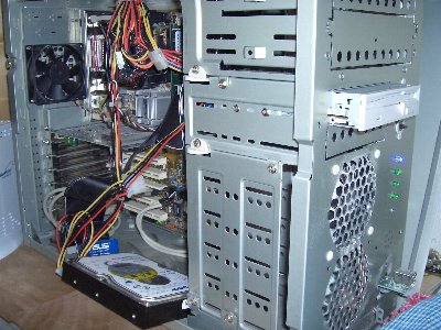 HDD増設すったもんだの格闘 - その4【あまり詳しくない人へ解説】 普通のぱそこんはハードディスクや光学ドライブ(CD-Rなど)等を4台接続できるようになっているが、それがいっぱいになった場合PCIスロットを利用してSCSIや今回のようにIDEを接続すれば何台でも増設することができる。ところが・・・・これでようやく ぱそこんとの格闘も終わりにできると内心 「ホッ!」 としてIDEボードの取り付け作業に取りかかった訳だが、これがとんでもない「曲者!」だった!IDEボードはすんなり入った、差し込むだけだ。あとはドライバをインストールすれば作業はそれで終了のはずだったがなんと付属のCDではインストールできないのだ。「あーー、なんかイヤな予感ーー!!」CDの中身を覗いてみたがさっぱり訳が分からずすぐ「玄人志向」の掲示板を検索してみた。驚いたことにドライバが入らないという書き込みがずらずらーっと山のように出てきた!「オェっ!!こんなたくさん苦労してる人がいるの??」読んでみると、付属のCDではインストールできず自分で製造メーカーのHPなどへ行って 自分で専用のドライバを見つけて事なきを得た、という人や それも試したができなかったという人など様々だった。「あーあ、またこんな不良品買ってしまった・・・」「IDE繋ぐと起動が何十秒も遅くなるから やっぱり使わなくていいんだ!!」と苦し紛れに自分に言い聞かせるが、約二千円の無駄な買い物が悔やみきれない。一万円でも良い物を買うならそれはそれでいいが、千円でも無駄なものだったら非常に悔しい。今考えると次に日パワーデポに行ったあたりから頭の中はオーバーヒート気味だった。いつもなら必ずメーカーのHPで下調べはするはずがなかば衝動買いに近かった。パワーデポにもひとこと言いたい!「専門店なんだからいい加減なことは言うなーー!!」「もっと販売する商品の情報をつかんでおけーー!!」HDD自体は使えるのだからしばらくはマスターを繋ぎなおしてそれぞれ単独で使い様子をみることにした。なのでマイぱそこんは写真のようにケースが外されたままである。(あーあ、情けない姿!!)とりあえずこのまま数週間様子を見ることにした。結果が分かるまで、続く
