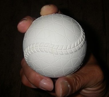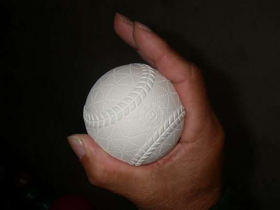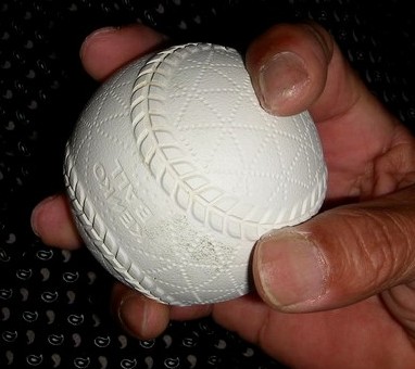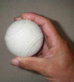 昨日の続きになりますが、B球で直球を投げようとすると下の写真のようにボールと握りの隙間が大きく開いてしまいます。 (Bボールの握り) (Aボールの握り)し かしAボールでは隙間が適当に開いてしっくりした握りになります。打者からみれば遠くに打球が飛んでいいようにみえます、投手からみると ボールが小さくていいようにみえます。しかし重量も軽いために変化球の切れもいまいちの感があります。Bボールを選んだ還暦野球の草案者に一言言わせてい ただけるなら、「もう少し話し合いをしてじっくり使用ボールを決めて欲しかった、