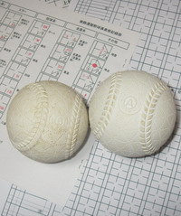 軟式ボールには、少年野球用にC球、中学用にB球(写真左)、高校・一般用にA球(写真右)、準硬式用にH球があります。我々還暦野球はなぜかB球を使用します。中学生と同じほどの体力か?いや体力的には中学生にはかなわないところがたくさんある。まず、走力・遠投力は小学校5年生とどっこいどっこい。速球の速さも中学生に負ける。勝てるのは振りの速さと遠くへ飛ばす力くらいか。口数も負けていない。予断はさておき、私が言いたいのは、B球とA球の大きさの違いである。当然A球のほうが大きい。問題は年はとっても手の大きさが小さくなっていないということである。大きい大人の手で小さいボールを投げるのは慣れないとうまくいかない。還暦野球を始めて4年になるが、いまだにしっくりいかない。投げたストレートは沈む、いわゆるお辞儀をする。A球で投げるとホップする。それほどでもないが(笑)。原因は手の大きさが中学生とは違うということだ。もちろん最近の中学生の手は大きくなっている事は承知している。