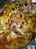 生地を伸ばし、ピザソースのかわりにカレーを塗ってチーズをかけます。ベーコンを適当な大きさに切り並べその上にカレーの具のジャガイモを乗せて、これまた具であった玉ねぎとほうれん草を乗せて焼きました。