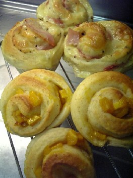 ベーコンチーズは生地の甘みとけんかしていると、不評でした。(泣き) でもそもそも甘いパン用の生地で惣菜パンを作った私がおろかかも。次は砂糖抜きの生地でうまいと言わせてやるぞ。