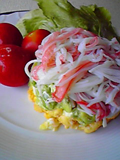 かにかまの赤、アボガドの緑、炒り卵の黄があざやかなサラダです。かにかまのプリッ感、アボガドのとろみ、卵のまろやかさもナイスな組み合わせの一皿になりました。