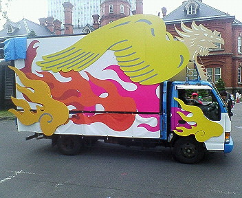 そう自分は先週の金曜から北海道まで行ってまいりました北海道に行った理由は札幌で行われているYOSAKOIソーラン祭りに参加するためで佐世保のチーム佐世保飛躍年隊について主に音響の仕事をさせてもらしましたその地方車(音響車)↓いや~本当に良かったいい勉強にもなったし楽しかっただけど2日目に急性胃炎になったのは最悪やったけど…まぁ~とりあえずジンギスカンにかにスープカレーに札幌ラーメン食べ物は全部うまかったっすよ