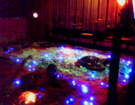 今日は、仕事でお世話になっているところの人と飲み会。那覇・久茂地の『亀千人』に行ってきました。ここ、インテリアがすごく凝ってます。店内には、デッカイ水槽。奥の席には、ごらんのような、箱庭みたいなセットがあります。ブルーのライトがちりばめられ、中央には、亀くんが。なかなか幻想的。おもしろかったですよ。