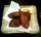 昨夜は、首里久場川町にある居酒屋、『くがに屋』に行ってきました。家の近くで、通勤の通り道にあるので、いつかは行ってみたいと思ってたんですよね。確かに、とっても気になる外観ではあるでしょ?? 今回は、まず、『ヒカーグヮー(スズメダイ)の唐揚げ』(左下の写真)や、以前にも登場した、ティラジャー(マガキガイという貝)入りの刺身盛り合わせ(右下の写真)といった、やや珍し目のメニューを注文してみました。「ヒカーグヮー」って、これ、露骨にスズメダイじゃないすか。って、俺、つくばに住んでた頃、こんなの水槽で飼ってましたもん。唐揚げで、食っちゃうんですね~。あ~、頭や骨はカリカリ、身は、結構ホワホワした白身です。 まあ、そんな変わったメニューもありますが、こちらの『串焼き盛り合わせ』(左下の写真)や、『ソーキの網焼き』(右下の写真)なんかは、とってもおいしそうでしょ~。 このお店では、首里の4つの泡盛ブランド(瑞泉、咲元、瑞穂、時雨)をブレンドした古酒(クース)がいただけます(左下の写真)。なるほど、瑞泉の重厚さ、咲元の香ばしさ、瑞穂のほのかな甘さ、そして、時雨のわさび漬けのようなスパイシーさがブレンドされると、こんな感じになるんですね。ところで、このお店、実は、張り子や琉球凧(たこ)など、沖縄の古い民具の販売なども行っていたそうで、店内には、そうした民具が賑やかに飾られています(右下の写真)。みているだけでも楽しかったですよ。 これまでの『沖縄のおいしいもの』はこちら