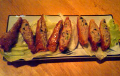 今日は、沖縄市泡瀬の居酒屋食堂『ま~さむんとぅたんや~・まは~ろ』で飲み会でした。 「まは~ろ」というのは、ハワイ語で「ありがとう」という意味なんだそうです。「ま~さむん」というのは、確か、沖縄の言葉で、「おいしいもの」という意味でしたよね。ここ、最近オープンしたばかりのようです。今回は、『とり皮ギョウザ 300円』(上の段左の写真)、『ホタテうに焼 500円』(上の段右の写真)、『チキンカツ 650円』(下の段左の写真)などを頼みました。どれも、お手頃な値段で、ボリュームたっぷりですよ。特にすごかったのは、チキンカツです。自分の手の平も結構でかいんですが、そのサイズの1.5倍はあるかもって感じです。しかも、揚げたてで、コロモもサクサク。デブのハートを釘付けにする一品ですよ~。 これまでの『沖縄のおいしいもの』はこちら