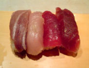 明日は、古川さんにリサイタルなので、今日は、東京に来ています。ホテルのチェックインまで、少し時間があったもので、築地のお寿司屋さんに、寿司食べ放題を食べに行きました。今日行ったのは、『ぎんざ まぐろや・築地店』。土日、祝日は、3000円+消費税で、店内にある40種類ものネタ、食べ放題なんです。『まぐろや』というくらいなので、最初は、まぐろを握ってくれました。赤身、本マグロ赤身、ビントロ、本マグロ中トロです(左下の写真)。いやぁ、最初っからマグロとは、豪勢ですね~。続いては、白身で、タイとヒラメ、それに、アジを握ってもらいました(右下の写真)。どれも高級魚ですよね~。ヒラメは、あとで、エンガワも握ってもらいましたが、これも、ぶ厚くて、いい食間。うまかったですよ~。 続いて、旬のサクラエビ!! そして、すっごく脂ののったイワシも(左下の写真)。 こんなネタまで食べ放題で、いいんですかぁ~~!? それに、ウニとイクラも食べ放題なんですもんね~。たまりませ~ん。 新鮮なネタ、食べ放題も最高でしたが、このお店、板さんの、「サヨリね~、今日はちょっと関西方面に出張中なんだよね~。」とか、「この店は、お客さんとは、ガラス越し(ショーケースの??)に触れ合うシステムになってるんだよね~。アフター5は、直接触れ合ったりもしちゃううんだけど!」みたいな、軽妙なトークも楽しめます。いいお店でしたよ。