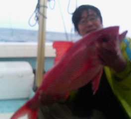 右上の写真は、そう! アカマチです。しかも、シッポが細長く伸びた「オナガ」。1m近くあるんではないでしょうか! 残念ながら、自分ではなく、師匠の柴田さんが釣ったものです。 でも、いいんです。こんな綺麗で、デカい魚が、釣り上げられるところを見られて、しかも、まだバタバタしている魚を抱いて、こんな写真まで撮れて、入門1日目としては、充分すばらしい経験でしたョ。 ほかに、柴田さんは、1mをはるかに越えるタチウオを2尾、アカマチをほかに2尾、たぶん、 エドアブラザメ っていうサメだと思うんですが、目が緑色の翡翠のように輝く、いわゆる深海鮫など、次々と大物を揚げていましたよ。
