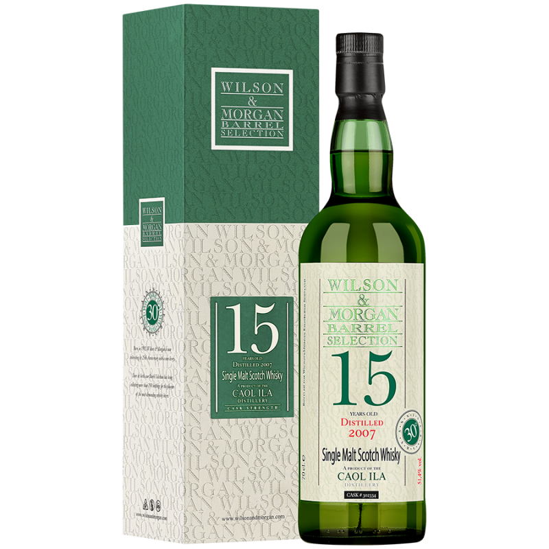 カスクストレングスシリーズの中でヴィンテージの異なる2つのボトリングは決して同じではありません。またそのウイスキーの高品質さを再現することは出来ません。それ故に世界中のウイスキー愛好家がウィルソン&モーガンをお気に入りとして最初に選ぶのです。ウィルソン&モーガンのカスクストレングスウイスキーにてウイスキー本来の力強い味わいをお楽しみください。カリラ 15年 30thアニバーサリー 51.4% 16720円(税込)★ カスクストレングス★ 1stフィル シェリーホグスヘッドフィニッシュ★ カスクNo. #302334 30周年記念ボトルのとても特別なボトルとしてリリースするのは、スモーキーでありながら20ヶ月のファーストフィルオロロッソホグスヘッドフィニッシュの影響を見事に受けたフレッシュで素晴らしいアイラモルトです。お互いの風味を全く妨げることなく、見事にマッチしていて、まるでシェリーとピートがとても良く調和することのお手本のようなモルトウイスキーです。香りは少しスモーキーで、レザーや、バルサミコ、カンフルやミントや農場っぽいオーガニック感、そしてとても印象的なフルーティさが背後にあります。そしてオレンジや桃、赤リンゴやチェリー、さらには少しトロピカルフルーツサラダの香りもあります。スモーキーさは味わいの方に良く表れていて、強いピートが全体を覆って調和を保っています。なめらかでクリーミーなフルーティさに包まれつつ、全体がナッツ感のあるドライなトーンです。オレンジマーマレード、ビターズ、クルミやローストヘーゼルナッツ。フィニッシュは長く温かみや灰っぽさが続きます