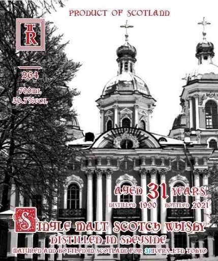 ~スリーリバーズオリジナル 「チャーチ」シリーズ第6弾 スペイサイドシングルモルト 1990年 31年熟成!~ 今回は「チャーチ」(教会)シリーズの第6弾のリリースとなりますスペイサイドシングルモルト1990 31年熟成をご紹介いたします。いつも通りスコットランドよりサンプルを取り寄せ、テイスティングを行ない、このスペイサイドシングルモルトの樽を購入しました。蒸留所名は非公開となっているため、残念ながらお伝えすることは出来ません。このシリーズ「チャーチ」(教会)は、世界各地の教会や聖堂の写真をラベルデザインに採用し、アーティスティックなラベルに仕上げました。今回はロシアのサンクトペテルブルクにあるニコライ大聖堂です。チャーチシリーズは30年オーバーの長期熟成品をチョイスしております。長期熟成ウイスキーを入手するのが困難な現在の状況の中、ようやく第6弾のリリースとなりました。今回のスペイサイドシングルモルト1990 31年熟成は、前回の1990 30年熟成と同様に蒸留所名は非公開です。前回の30年熟成に近いニュアンスで、ラフランスやオレンジキュラソーの甘いエレガントな香りから、ボディに奏でる長期熟成たる繊細な陶酔感を心ゆくまでご堪能下さい!SPEYSIDE SINGLE MALT 1990 31yo 50.7% 70cl HOGSHEAD総数264本 41000円 (税込) 完売テイスティングノート – 香りはクリーミーなラフランス、バナナ、甘いフローラル、ミント、味は甘いフローラルなボディ、ラフランス、ジンジャー&ミント、奥からドライなスモーク、フィニッシュはホットなブラックペッパー、シャープなスモーク。