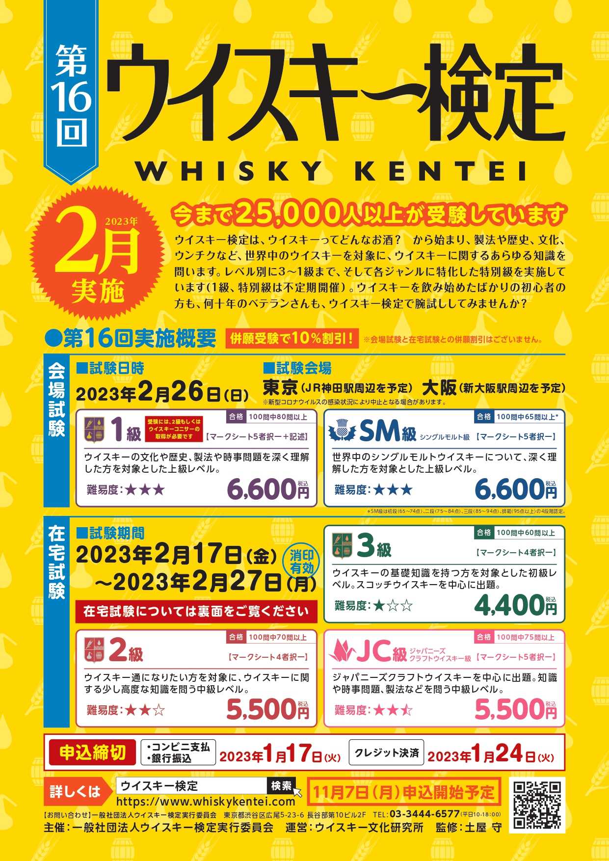 今年度アンバサダーとして任命されたウィスキー検定ですが当店のお客様も受験された方もちらほらいらっしゃりお疲れ様ですた、次回2月の募集も始まりましたので是非皆さんのチャレンジをお待ちしております【第16回ウイスキー検定 受付開始!】2023年2月のウイスキー検定は、在宅試験と会場試験での開催となります。在宅試験は3級、2級、ジャパニーズクラフトウイスキー級、そして会場試験は1級とシングルモルト級です。皆様のチャレンジをお待ちしています!!実施概要はコチラ↓https://whiskykentei.com/gaiyo/
