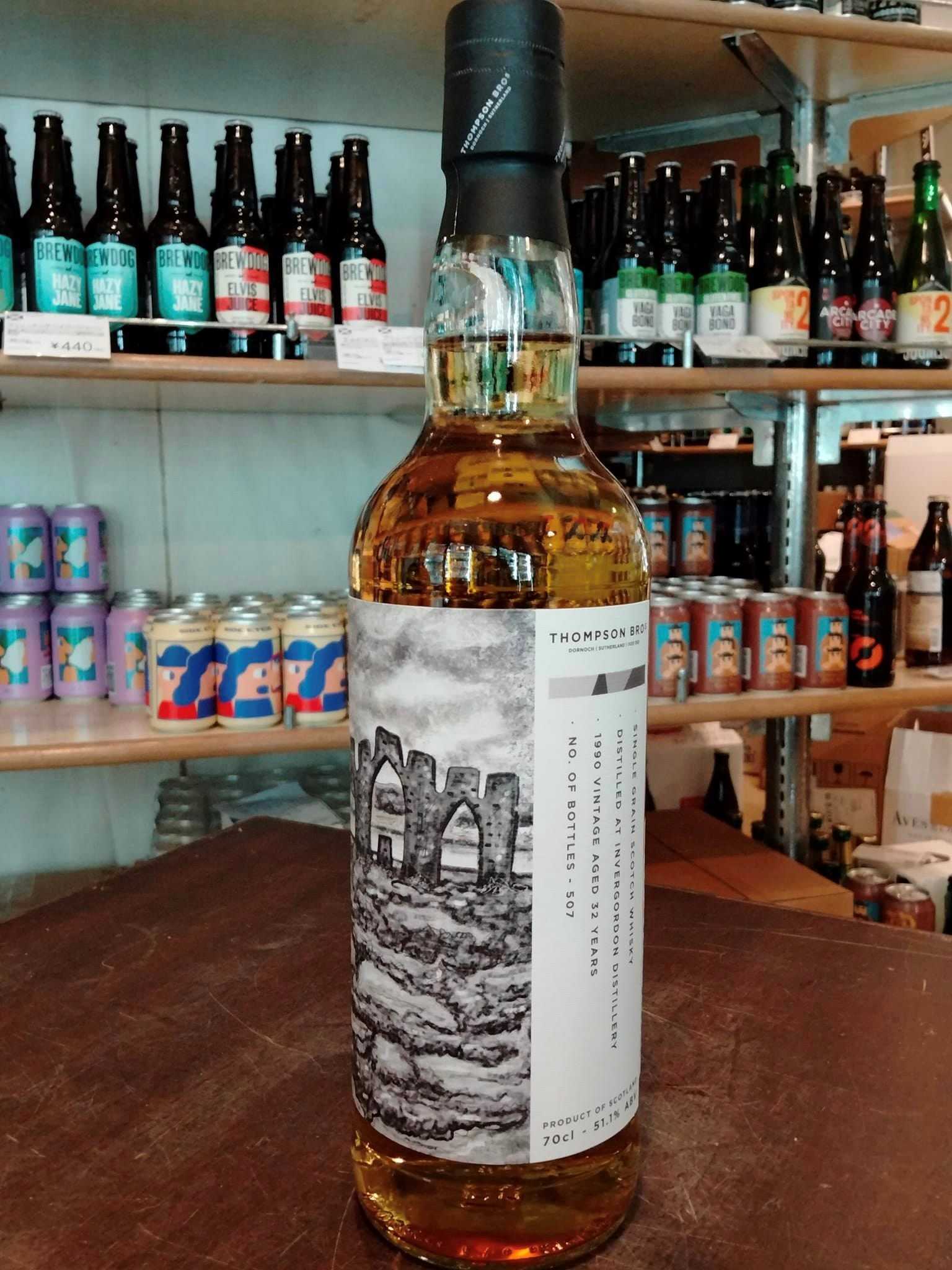 「THOMPSON BROS INVERGORDON 1990 32年 SINGLE GRAIN SCOTCH WHISKY」 51,1度 700ML 22000円(税込)・蒸溜所:インバーゴードン・タイプ:シングルグレーンスコッチウィスキー・樽:2樽Xリフィルホグスヘッド・本数:507本・輸入:48本~テイスティングノート~・NOSE:コーンチップ、バニラクリーム、洋梨キャンディー、セージ、サルサベルデ、菜種油、グレープフルーツピール ・PALATE:カスタードクリーム、グレープフルーツピール、セージ、ほのかにディジョンマスタード、カットグラス ・FINISH:やわらかいスパイシーさ、カルダモン、ホワイトペッパー、ドライシトラスピール