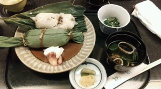 ご飯にうなきを入れて、笹の葉で包んで蒸したものです。