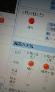 明日は、津市高茶屋でレディオキューブFM三重のイベントカーのお仕事その前に、気になるお天気をチェックすると・・・晴れ キタ━━━━━━(゚∀゚)━━━━━━ッ聞くところによると、営業さん晴れ男。あやぞうも晴れ女。いい感じ~~~~~~~~~~そして、翌日の27日(日)は鈴鹿の中勢自動車学校で交通安全フェアのイベントのお仕事。こちらも晴れ ヤッタ━━━━━━(゚∀゚)━━━━━━ッ天気がいいとテンションあがっちゃいますねぇがんばってきま~す