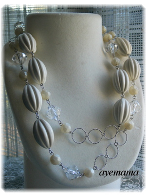 結構大き目のプラビーズのピンつなぎネックレスです。このでかいナツメビーズは、結構前のビーズマーケット展だったと思います。浅井緑子さんのキットで見て、いいなぁ~と思い買っていたのですが自分ではどうにも使えず、今まで寝かしていましたって、そういうの多いです…私(^^;ロングのネックレスの撮影は難しい!基本は一連、アジャスターをつけて二連にも出来るようにしてあります。それから、タイトルにもあります「クレイローズ」楽天のMihoさんに習って作ってます。ローズもパーツとして作っています。簡単に取り外しできます。二種類作ってみました。黒いバラは、ま~るく作り、かなりパーツとして意識しました。くすんだピンクはコサージュにもしてみたいなぁと思いながらの作品です。~*~*~*~*~*~*~*~*~*~*~*~*~*~*~*~*~*~今、娘とはまって見ているTVが「のだめ…」です娘はエレクトーンのアンサンブルのコースにいっているのですが来年の発表会は「ラプソディ・イン・ブルー」になりそうでとりあえず、雑誌のピアノようにアレンジした楽譜で毎日弾いています。今日仕上げになるようで、これが終わったら次は「ラフマニノフのピアノ協奏曲第2番」おい!千秋さまにして「こんな難曲」と言わしめているのに…でも、毎日ピアノの練習をしてるのは…のだめに感謝(以前は言わないとやらなかったので)パパも…いえパパは「のだめ」が嫌いです。どうもあのしゃべり方がだめなようでちなみに「電車男」もだめだったようで、イライラするようですがラフマニノフ好きのパパは、娘がそれを弾いてくれるので、そこだけ「のだめ」に感謝かな(^^;