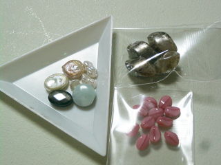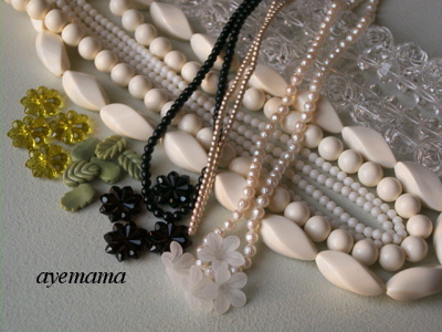 ご無沙汰しております。なかなか作品が作れませんでした。編んでは解き…の繰り返しこれは、淡水パールのクロスでアソートパックに入っていたもののどう使ってよいものか悩みました。本日やっと日の目を見た…かな(^^;でも、そのクロスはどこ?って感じですよね埋もれています…淡水、メタルパーツの下です(^^;