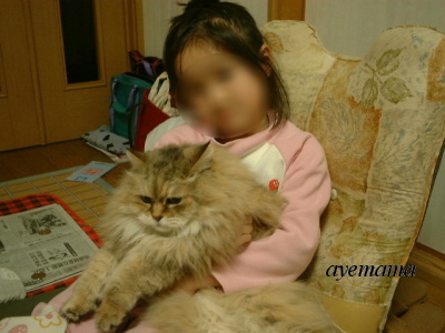 お久しぶりです。この一週間、娘はウチにおりました。前半、風邪で休み!治った!と思ったら…学級閉鎖(TT)元気でウチにいるともうヒマヒマ星人です。私もまだまだ締め切り作業が残っているので、仕事を休むわけにもいかず月曜日から病院へ連れて行き、おばあちゃんへ任せて職場へすると、やっぱり、おばあちゃんにもうつるし(TT)なんだよぉ~と思いつつのあっという間の一週間でした。グチグチのつまらない日記だったので画像をひとつ!プリントアウトはしていたのですが、パソのどこにあるか行方不明だった画像を発見!前に飼っていた猫です。まだ、娘も幼稚園くらいかな大きいでしょう!でも、毛玉みたいな猫だったので身は結構細いんですよこれ、雑種なんですがちょっとゴージャスでしょお母様が白のペルシャなんですが、ちょっと脱走したときにできたお子様のようです(^^;で、だから、買ったのじゃなくて、もらったの18歳、長生きの猫でした。