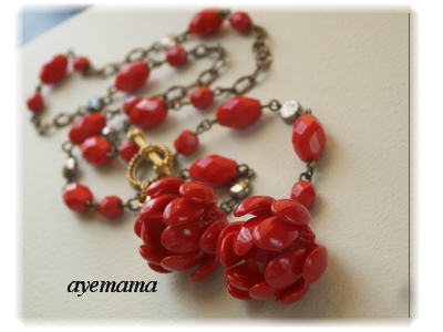 やっとの作品アップです。実はお花モチーフは随分前に作っていましたこれは、以前やったビーズ交換のときにいただいたビーズなんですお花のモチーフを編んだらもう、すごく気に入りましていいビーズをいただいちゃいました。ありがとう♪でも、モチーフは編めたのですが、ネックレスにしようと思っても合うビーズが無い!先日浅草橋に行ったときにオペークの赤のチェコを見つけたのでやっと作品に出来ました微妙に色が違うんですけどね。(^^;トルソーにつけるとこんな感じトルソーのネックが細いので下がるタイプのように見えますがいつもの(^^; 短いチョーカー長さのものです。お花モチーフに使ったビーズは、チェコのペタルビーズを長くした感じです。もし、どこかで見たわ!とおっしゃる方、教えてくださいませぇm(_ _)m