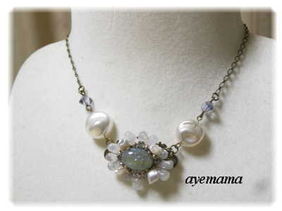 久しぶりの作品アップ(^^;いや~作品のネーミングに悩む今日この頃です。まんまです!ムーンストーンのドロップって言うのを随分前に買っていましたが1年以上寝かしていたかなぁ~やっとお披露目真ん中は、Jさんの福袋に入っていたカボション!でも、爪が無かったんですよねぇで、普通の爪につけてすかしパーツに編みこみました他にケシの淡水パールと形の不ぞろいの物を使ったので(ムーンストーンも大きさ、穴の位置がバラバラ)どうにも収まりが悪い!しかし、天然物は色が微妙っていうんですか、やっぱりいいですねチェーン部分がちょっと弱い!ピンつなぎに直そうかなぁ~…根性がぁ