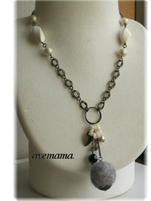 またまた、手作りフェルトボールを1個使ったネックレスです。いや、まだフェルトボールは残ってるんですよねぇ(^^;娘と沢山作ったものですから、次はどうしましょうで、このネックレスですが、ボーンビーズのフラワー(これは、もう大好きなビーズです。シェルのフラワーとは違う透明感の「無さ」がツボです。)フェイクパールやスワロと組み合わせてみました。トップ部分を拡大すると手作りフェルトボールはちょっと楕円ですが、ご愛嬌♪これからの季節にちょうどいいかなぁと(^^)