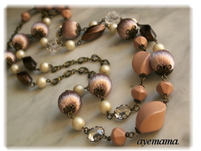 ピンつなぎのロングネックレスです。ほとんどプラパーツなので軽く出来ています。モーヴカラーと言っていますが、若干ピンクが強いかなぁ画像はどうでしょう、パソによっても見え方が違うと思いますが ロングの撮影は難しいんですが、いろいろやってみました。~*~*~*~*~*~*~*~*~*~*~*~*~*~*~*~*~ただ今、娘は本日4時間目のピアノレッスン中です(^^;昨日今日と連荘なぜかと言うと、お友達が作曲演奏のコンサートに出るのですがそのお手伝いといいますか、一緒に演奏させていただきます。で、本日、作曲の先生の先生?からのチェックがあるそうで昨日から、やさし~いうちの先生もちょっとピリピリ…かな出来によって先生が怒られるとか(^^;その作曲の先生に見ていただく前に2時間半、先生に30分特別レッスンでした。で、4時間目ですが、これはいつもの個人レッスンです。くたくたで帰ってきそうですね