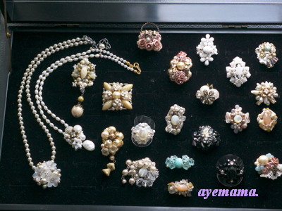 「なんじゃこりゃ!?」というくらい付けました(^^;水晶は以前購入した「アソートパック」に入っていたものパールはフェイクです。こうするつもりは無く、なんとなくピン曲げして作っていたものが合体した感じですあ!だから付け過ぎになったのか(^^;まだ、ザル(シャワー)に付いているだけです。ブローチ…かな!?リングにはゴツイし!ペンダントヘッド…これはネック部分しだいでいけるかちょっと迷っています。おっとぉ、作品がまだでした中心はMOPです。~*~*~*~*~*~*~*~*~*~*~*~*~*~*~*~今、ボサノヴァのCD聞きながらアップしています。パソしながらには、ちょうど良いかなぁってで、思ったんですが、ビーズ作品を作るときも色々聞いているんですがはかどる音楽ってあるんですよねジャズ、クラッシック、Jポップ、アニソンまで(^^;結構なんでも「あり」なんですがクラッシックならやっぱりモーツアルトが手が進むというかみなさんも作るとき(たぶんココには作り手さんがいらしているとおもうので)何か聞いてらっしゃるのかなぁ?
