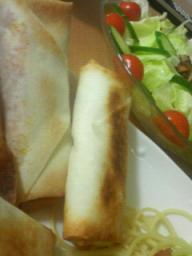 ☆☆☆☆☆☆☆☆春巻きの皮と餃子の皮って何が違うんですかね~。四角と丸の違い?でも四角の「棒餃子の皮」ってのもあった。春巻きの皮の方がなんとなく強度がある気がしますが・・・。こないだ春巻きの皮で作った春巻きでない物。ミートソースにニンニク・玉ねぎ・チーズを加えた物と、クリームシチューを春巻きの皮に包んでオーブンで焼いてみました。 (パスタに添えて・・・)パリッ。トローッ。おいしい正解。油で揚げているわけでもないから リードのホットクッキングシートで余分な油も吸ってくれるので(笑)多分、ヘルシーです。餃子の皮だとおつまみ的になるのでオススメです。☆☆☆☆☆☆☆☆designed by yumeyumeko