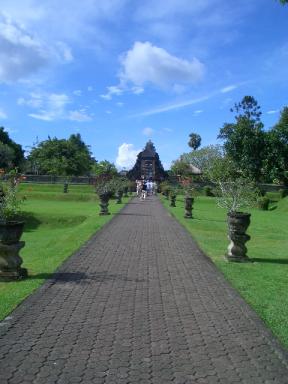 ☆☆☆☆☆☆☆☆バリでブラブラ略してバリブラ夕方からはHISのオプションで寺院に行きましたホテルから車で約30分タマンアユン寺院に到着です。 こちら、どうやらバリで2番目に広いという寺院みたい。なるほど広い 中(日本で言うと本堂?)には入れませんが境内の周りから覗く感じで・・。空の青と芝生の緑がとってもくっきりでキレイですとても神聖な場所なのであまりの露出は厳禁だそうです・・。タマンアユン寺院を出てさらに車で15分。いよいよこのオプションのメインであるタナロット寺院に到着ここはガイドブックにも載ってたので、絶対に行きたかった場所です。夕日がとてもキレイだそうで。ワクワクしながら時が経つのを待ちました・・・。1時間半くらい待ったかな、18時20分、ついに夕日が写真で見るよりもやっぱりキレイ 来て良かったと感動しながら雲の合間に見え隠れする夕日を見ました。オプション企画の最後は、インドネシア料理です。ナシチャンプルとビンタンビールをおいしくいただき、ホテル路につきました。 ☆☆☆☆☆☆☆☆designed by yumeyumeko