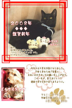 今年は、いただいた年賀状の数が増えたように思います(^^)ネットでのお友達からも、年賀状いただいて嬉しかったです(^^)昨年は年賀状が出せなかった&いただけなかったものだから、逆に連絡先が分からなくなってしまって戻ってきたハガキもちらほら。人との繋がりを考えたら、喪中ハガキを出す代わりに少し遅れても寒中はがきでご挨拶差し上げる方が、良いのかもしれないなぁー・・・と思ったのでした。実はプリントしすぎて、印刷済みの念がハガキが余ってはいるのですが、もうお出ししたい方には一通り出せたかなーと思うので、今年の年賀ハガキのデザインを掲載しちゃいます。自分たちの分と、私の母の分の二種類を作ってます。挨拶状の類はあんまし得意でないです(^_^;)というのも、自分の物って一番作りにくい。。。(^_^;)困ったもんだ(^_^;)今年は猫年??(笑)さけ嬢、年賀状に初参戦ですよー。ハリーさんもしっかりいます。今回、初めてイラストレーターというソフトを使って作成しています。ホントはもっともっと多彩ないろんな事の出来るソフトなんだけど、大した事出来てません(^_^;)トホーー(^_^;)今年は、このイラレとフォトショを使いこなすのも課題です(^^)母の分は、恒例で、母作の干支の編みぐるみを預かって撮影するところからの制作になります。今年は3匹預かって、3匹一緒の写真をいくつも撮影したのですが、どうにもこうにも形に出来なくて、結局こうなりました(^_^;)こっちはいつものウェブアートデザイナーで作ってます。で、いくつも撮影した中には、こんなのもありました(^_^;)食っちゃダメだよ(^_^;) もっとわんこ&にゃんこモリモリのブログが読みたい人はクリック♪どんなもんかなーー?って思って貼ってみたランキングですが・・・なだか、機械で巡回してるどっかの業者の人とかのおかげで、ずずーいと順位上がってるようです(^_^;)申し訳ないほど、最近更新してないというのに(^_^;)折角わんにゃんのブログランキングに参加してるので、さけ&ハリーの写真ももう少し載せていけたらいいなー。ぐうたら主婦のランキングの方も上がってるな。。。ぐうたら主婦のレベルが上がると、ぐうたら度が上がる・・・それはちょっとイヤかも(^_^;)