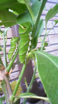 白くてむっちり♪可愛いあんよを見てちょうだい♪むちゃくちゃ可愛いでしょう?!bbんちの庭にはレモンとライムの木があります今はアゲハの赤ちゃん達がもりもり食べてもうて、丸裸状態です食べられる葉っぱはもうないのに、赤ちゃんは8人!急いで近所のホームセンターでレモンの木を買って来て赤ちゃん達を移動しましたどう移動したかって?もちろん指で優しくつまんで♪プニプニだったぜぇ~い♪普通は威嚇して黄色いツノを出すざんしょ?それがね「あっちの葉っぱがいっぱいの方に移ろうねぇ~まんまいっぱいあるよぉ~」などと話しかけながら赤ちゃんをつまむとツノを出さないんです♪信頼していただけたのかしらん?これは8人全員とも共通しておりました!!たまにポロッと下に落ちている子もおりましてね無言でつまむと威嚇されます話しかけながらつまむと平気です是非、お試し下さいませ♪ゲイリーに話すと悲鳴をあげそうだなぁ