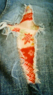 昨日買ってきた素材でヒザの穴をリペア(修理)してみましたまずは穴がふさがる大きさにジーンズ生地を切りました同じ大きさに和柄の生地も切りました二つを接着剤でくっつけましたジーンズを裏返して、マチ針で生地を仮止めしつけ糸でさらに縫う表に返してからジーンズ用の糸でチクチクチクと、縫っていきました和柄の生地は薄いので、ジーンズ生地と接着して補強和柄が敗れてしまっても、下のジーンズ生地でなんとかなるでしょう!縫い目が雑でもいいのです人のヒザをじーーーっと見る人なんていません動いていれば縫い目なんて見えません自己満足なリペア(修理)でありましたかかった費用は和柄30cm758円(30cmからでないと、販売してくれないのです。実際には10cm程度しか使用しておりません)ジーンズ用の糸258円で、1016円なり~♪ すみません、リペア前の写真をずーーっとUPしておりました