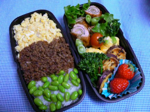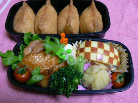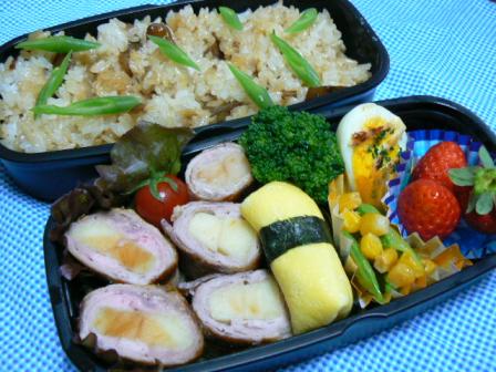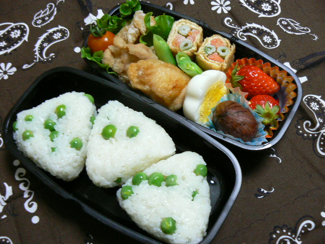 今日から息子の弁当作りが始まりましたマンネリ化しないための記録として、いつまでつづくかはわかりませんががんばります☆ グリンピースご飯 グリンピースを塩茹でして汁ごと冷ますとシワシワになりません。 ゆで汁でご飯を炊き、炊き上がりに酒をふって蒸らしてグリンピースをまぜます。☆ 鶏のから揚げ 塩こしょうと片栗粉で☆ 信田巻き 薄揚げを開いて、人参といんげんを巻き、かんぴょうで留め、 だし・醤油・みりんで煮ました。☆ ゆで卵☆ 栗の渋皮煮 昨秋、栗の時期に作って冷凍してあります。☆ スナップえんどう、プチトマト、レタス☆ いちご