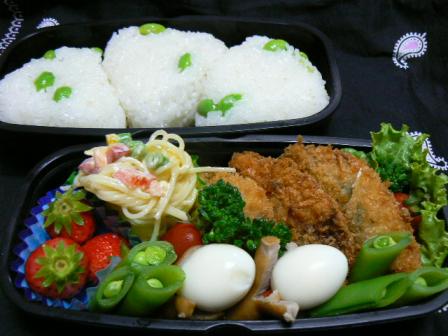 久しぶりのお弁当です枝豆ごはん白身魚のフライウィンナー&うずらのゆで卵スパサラスナップえんどう・いちご次のお弁当はしばらく空いて、6日