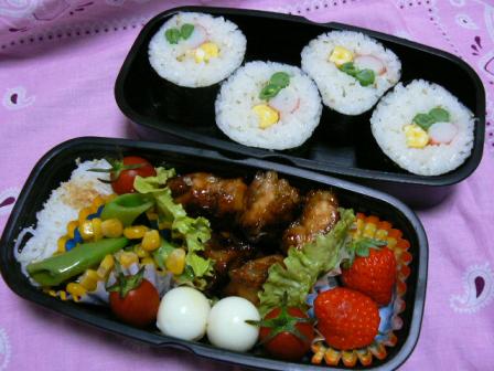 なんだか画的に残念なお弁当になってしまいました なんでだろう・・・のり巻き(かにかま・いんげん・卵)鶏肉のはちみつ醤油焼き結び糸こんにゃくの明太まぶし 結び糸こんにゃくを1~2分茹でてお湯を捨て、 乾煎りをし、明太子を絡めるスナップえんどうとコーンのソテーうずらの茹で卵フルーツトマト・レタスいちご
