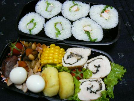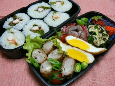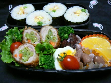 豚肉の野菜ロールフライ弁当のり巻き(卵・いんげん・鮭フレーク)豚肉の野菜ロールフライゆで卵煮豆(金時豆)栗の渋皮煮日向夏