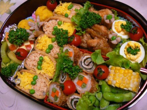 レタス巻き(エビ・カニカマ)ささみの明太巻きじゃが芋餅うずらウインナー五目豆茹でコーン栗の渋皮煮フルーツトマト
