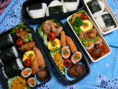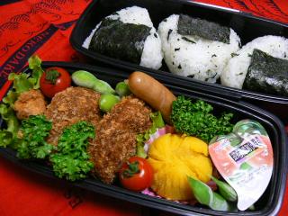 わかめおにぎりコロッケから揚げ栗きんとんウインナー枝豆プチトマトゼリーあ~、明日は運動会降らなきゃいいけど