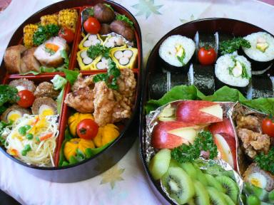 おにぎり(カリカリ梅)エビカツパンプキンサラダウィンナー茹でコーンいんげんとコーンのソテーミニトマト巣籠り卵も用意してあったのですが、入りきらず断念